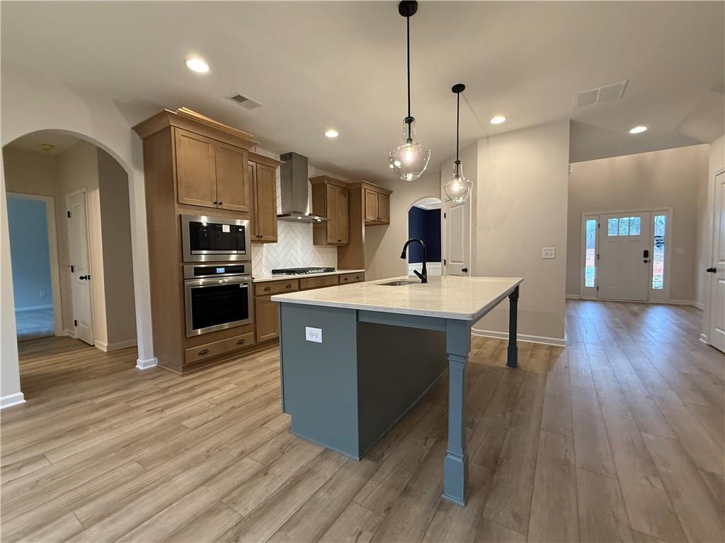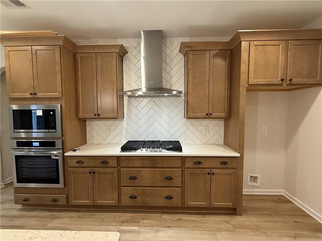 Description: Welcome to Wyndham Village, a charming Hughston Homes community in Opelika, Alabama! This spacious Jackson B plan offers 5 bedrooms, 4 full bathrooms, and 3,324 square feet of beautifully designed living space. Step inside to find an inviting foyer, a formal dining room with elegant detailing, and a versatile flex space ideal for a home office. The open-concept great room features a cozy gas fireplace and abundant natural light, seamlessly flowing into the gourmet kitchen, complete with stylish cabinetry, recessed lighting, quartz countertops, a tiled herringbone backsplash, stainless steel appliances, including a gas cooktop, microwave/oven wall combo, and Stainless Steel vent hood. The spacious center island has a built-in sink and upgraded dishwasher that overlooks the bright breakfast area. The generous pantry offers excellent storage space. Our signature drop zone with built-in cubbies adds convenience and storage. A guest suite with its own access to the full bath on the main level offers privacy and flexibility. Upstairs, the oversized owner’s suite boasts tray ceilings, a luxurious bath with a garden tub, a platinum tiled shower, and a large walk-in closet. The secondary bedroom with a walk-in closet and private full bath is ideal for a teen or in-law suite. In addition, two more generously sized bedrooms, a full hall bath, and a centrally located laundry room. Luxury Vinyl Plank flooring extends throughout most of the living areas on the main level, along with an impressive list of included Hughston Homes features, including blinds on the front of the home, an irrigation system, home automation, and more. Step outside to enjoy the Gameday Patio with a wood-burning fireplace, perfect for fall football gatherings! Community amenities include a pool, playground, and pavilion, making this home a perfect blend of luxury and lifestyle.