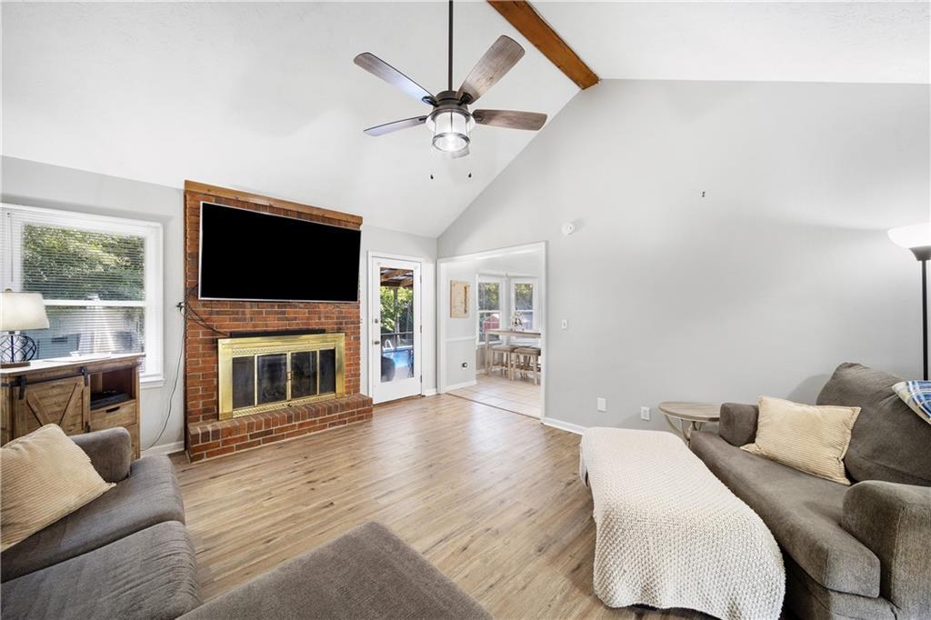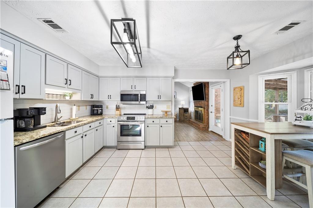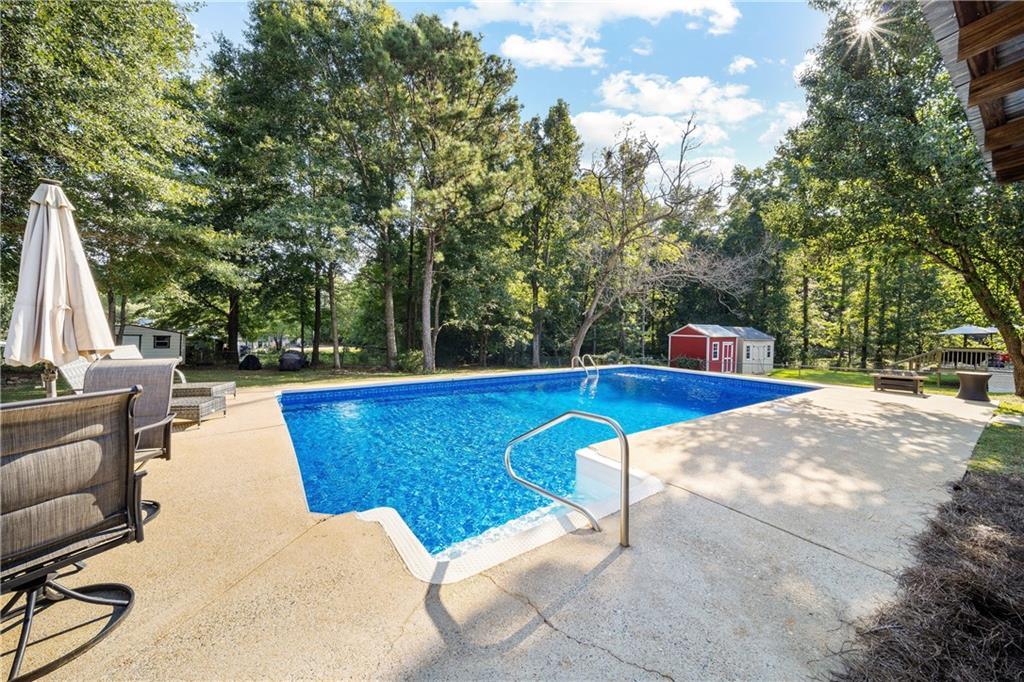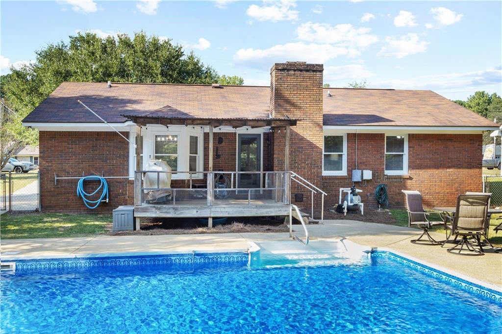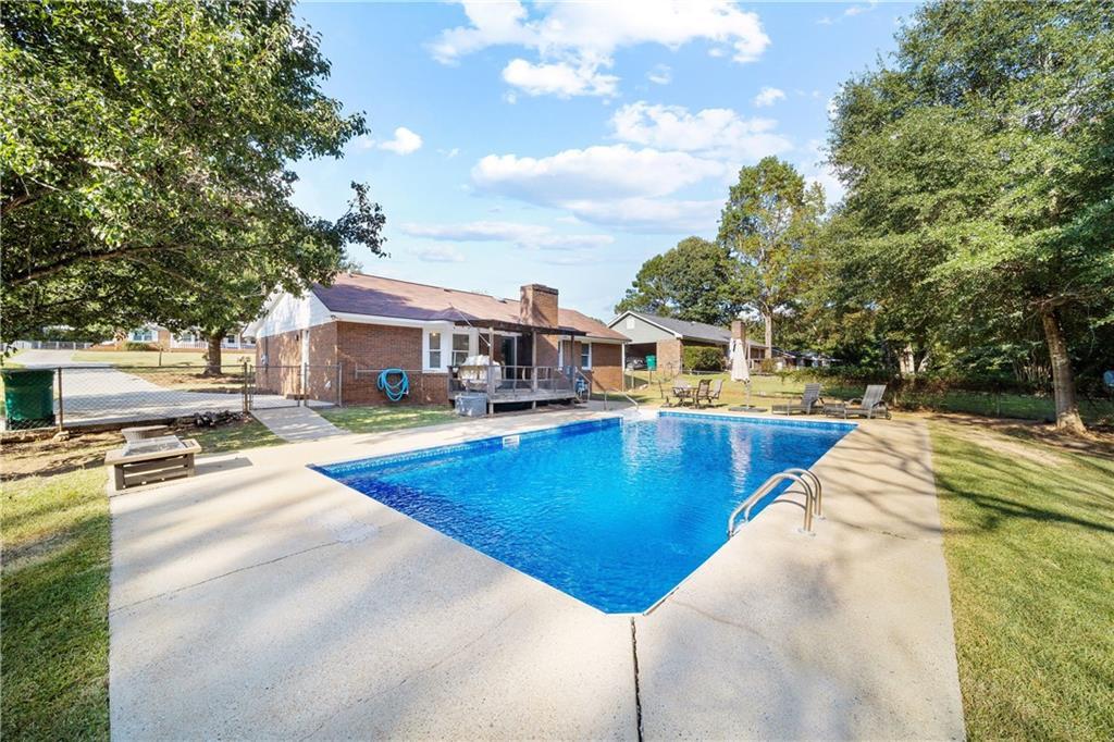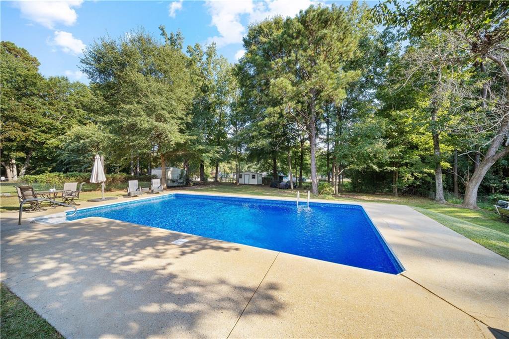 Description: Enjoy your morning coffee on the covered front porch, then step inside to discover a spacious layout featuring a split-bedroom floor plan for added privacy. The updated kitchen, completed in 2022, includes stainless steel appliances, modern cabinetry, and ceramic tile flooring, perfect for everyday cooking and entertaining.The living room is warm and inviting, showcasing new LVP flooring and a charming wood-burning fireplace. A bay window overlooks the sparkling inground pool, adding natural light and a relaxing view. The large laundry room provides extra space and convenience. The primary suite offers a walk-in closet, a freshly painted en-suite bath with new flooring, and a tiled tub surround. Secondary bedrooms are located on the opposite side of the home, ideal for families or guests. All bedrooms have ceiling fans. Step outside to your private backyard retreat, featuring a refreshing inground pool + the half acre lot has more room to play, entertain, or relax, and a storage shed that stays with the property. Additional updates include a new roof and HVAC system (2019), offering peace of mind for years to come. hot water heater and pool linear installed in 2022.