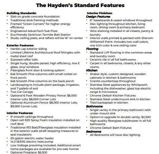 Description: Pre-sale on Lot 68! Choose your selections! 6 month build-time. The Hayden is three bedrooms, two bathrooms and spans across 1411 square feet. When you enter into the home, the foyer leads into the laundry room and access to the two car garage. The home flows into the open concept dining and kitchen area that features a large center island, a spacious pantry and floor to ceiling windows. The kitchen opens into the living room that overlooks the back covered porch. The primary bedroom rests on the back of the home and features a spacious walk-in closet and bathroom. The second and third bedrooms are on the front of the home and share a hall bathroom. Phase 1 amenities include a dog run and fire pit area. Pool, pavilion, and pickleball court to be amenities in a future phase.