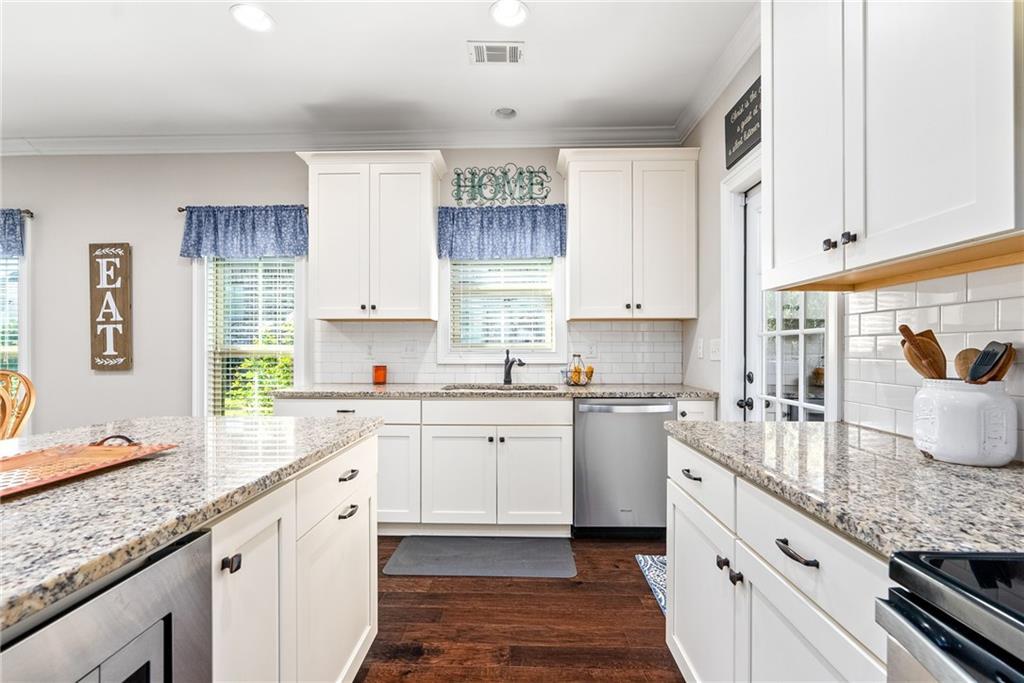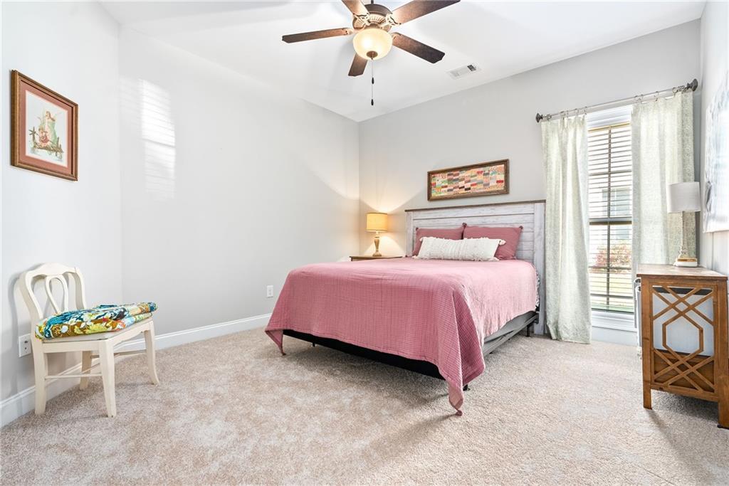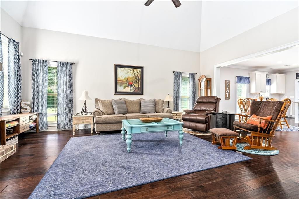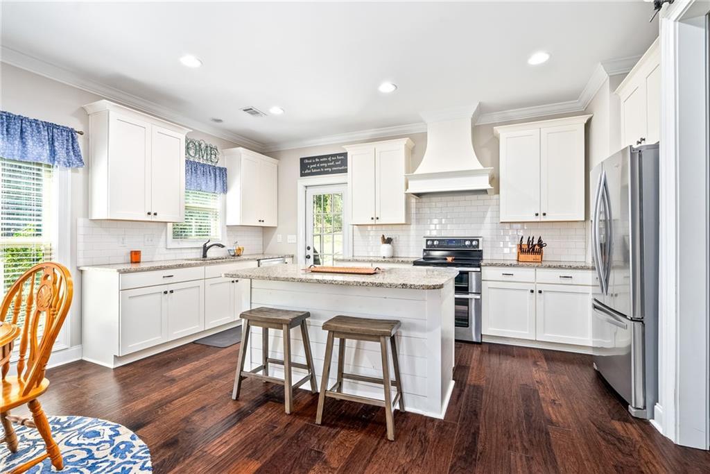Description: This stunning Druray Plan by Holland Homes combines timeless cottage-style architecture with modern comfort and thoughtful upgrades throughout. Featuring an open floor plan and 4 spacious bedrooms, this home is designed for both style and functionality. Step inside to a bright, inviting living space with hardwood floors, a gas log fireplace, and a vaulted ceiling that flows seamlessly into the dining area. The kitchen is a true highlight, offering a large center island, granite countertops, tile backsplash, stainless steel appliances, a double oven range (March 2025), built-in microwave, and a walk-in pantry with a sliding barn door. The refrigerator stays with the home. The primary suite on the main level boasts a spacious walk-in closet and a luxurious ensuite with a soaking tub, separate shower, and dual vanities. Upstairs, additional bedrooms provide great closet space and a guest bath with updated tile (December 2023). Enjoy relaxing mornings or cozy evenings on the covered rear porch, with a fenced backyard offering extra outdoor living space. The attached two-car garage, attic storage, and dedicated laundry room provide everyday convenience. Located in the sought-after The Meadows at Highlands! This neighborhood offers a low-maintenance lifestyle with HOA services that include: Lawn mowing & edging, Flower bed maintenance, pine straw, fertilizer & weed control. This home has been beautifully maintained and upgraded, including: Roof replaced April 2022, New carpet in bedrooms October 2025, Interior paint touch-ups for a fresh feel, Extended patio (2025) — perfect for entertaining, Fenced yard for privacy and pets, Irrigation system to keep the lawn lush, Alarm system for added peace of mind.