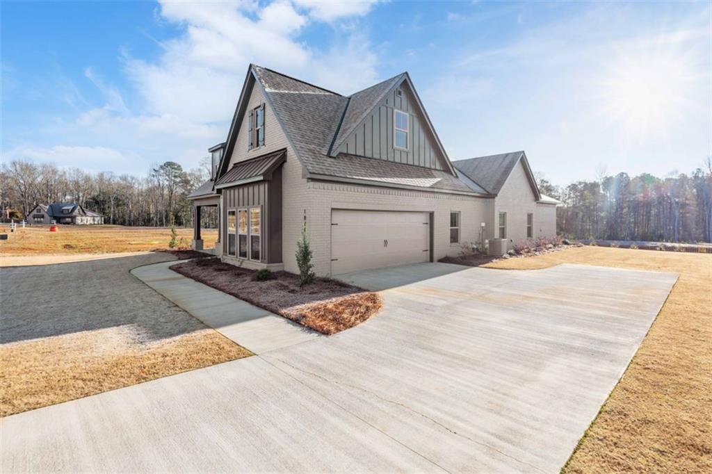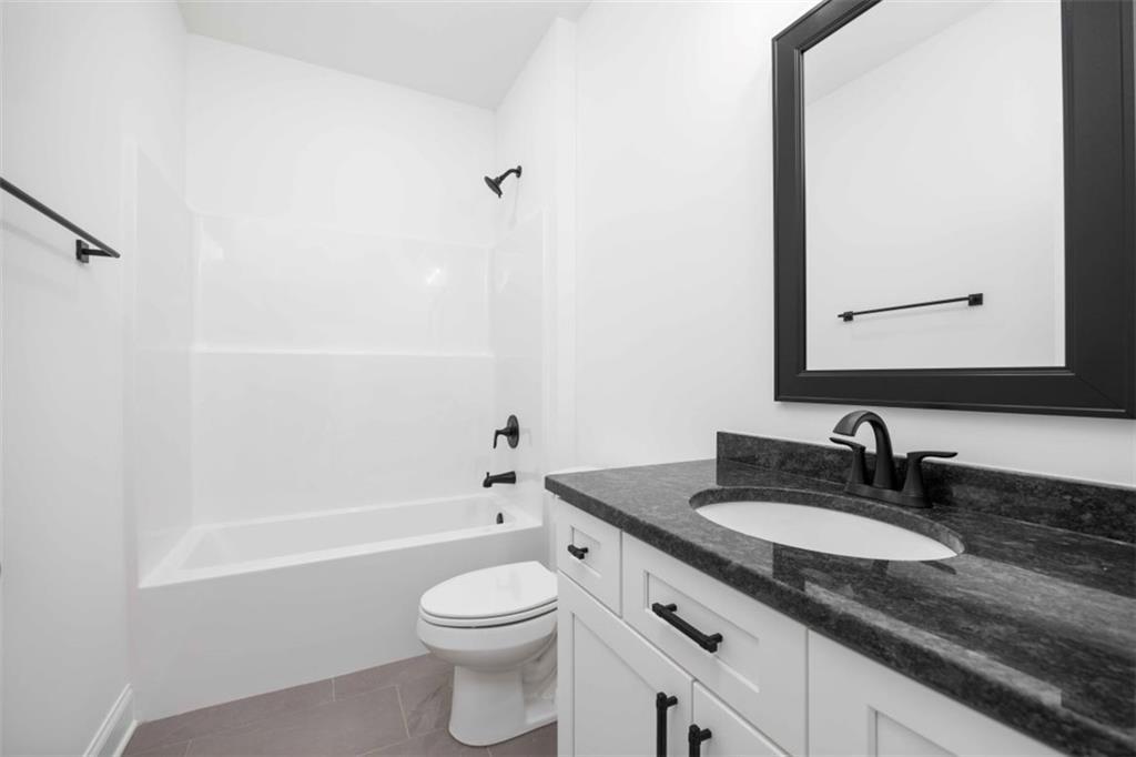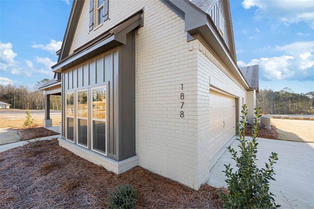 Description: This stunning new construction home delivers clean modern style from the curb all the way through the interior. The exterior features a painted brick finish in a warm, neutral tone that pairs beautifully with dark trim accents and a covered rear patio overlooking a wide, level backyard. Inside, the open layout is bright, spacious, and thoughtfully designed for everyday comfort and entertaining. The kitchen is a true standout with its oversized quartz island finished in a deep charcoal gray, adding contrast to the crisp white cabinetry and subway tile backsplash. Glass pendant lighting, a gas cooktop, stainless steel appliances, and generous counter space give the room both function and polish. The kitchen opens directly to an impressive great room with a vaulted ceiling, exposed center beam, and a brick fireplace framed by custom trim that draws the eye upward. The primary suite offers a relaxing retreat with a tray ceiling, soft natural light, and a spa-inspired bath. The bath includes a freestanding soaking tub, a large tiled walk-in shower with glass door, and a double vanity with quartz counters and matte black fixtures. Secondary bedrooms are well-sized with fresh, neutral carpet and large windows that keep each space light and inviting. The guest bath continues the modern feel with black hardware, clean lines, and durable finishes. Additional highlights include a dedicated laundry room with a sink and storage, a walk-in pantry conveniently located off the kitchen, and durable hardwood-style flooring throughout the main living areas. This home delivers a balanced blend of modern simplicity and timeless details—move-in ready and designed to live beautifully from day one. This is the Kinglet II Plan https://bcstonehomes.com/plan/kinglet-ii-a-brick