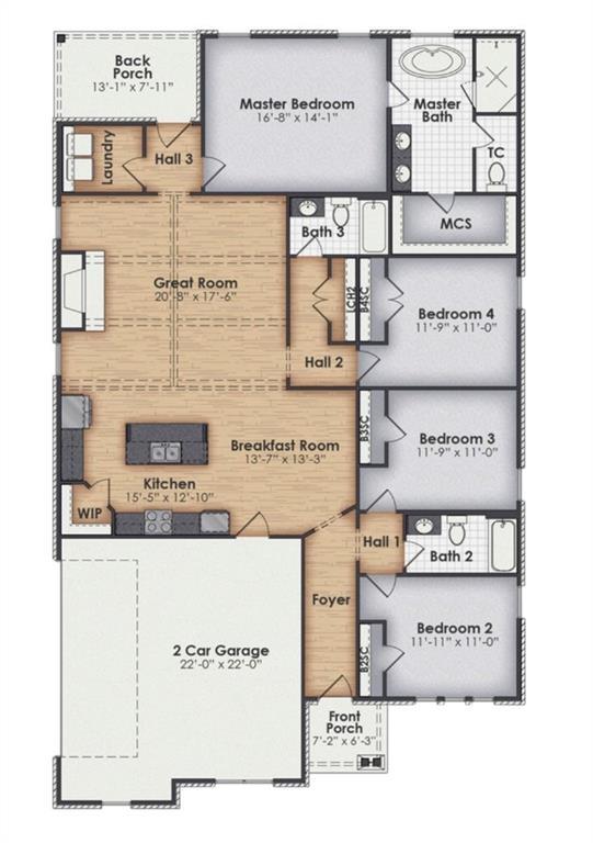 Description: The Emerald A brings together style, function, and comfort in a layout that simply makes sense. From the moment you step inside, the spacious great room with a vaulted ceiling that immediately sets the tone. The kitchen sits at the heart of the home, designed with an oversized island and a generous walk-in pantry that keeps everything organized and accessible. It’s the kind of space that works just as well for everyday living as it does for hosting. The split layout creates natural separation, giving everyone their own corner of the home. One side features two secondary bedrooms with a shared bath, while another guest suite sits privately on its own—perfect for visitors who appreciate a little breathing room. The owner’s suite is tucked away and offers a calm, quiet retreat with thoughtful flow and plenty of storage. Every inch of this plan is optimized for easy living: all on one level, wide-open gathering spaces, and smart placement of rooms that support both connection and privacy. The covered back porch expands your living outdoors, giving you a chance to unwind, sip coffee, or enjoy a peaceful view at the end of the day. If you’re looking for a plan that balances beauty with everyday practicality, the Emerald A delivers it with ease. Perfect for anyone who wants comfort without sacrificing style.