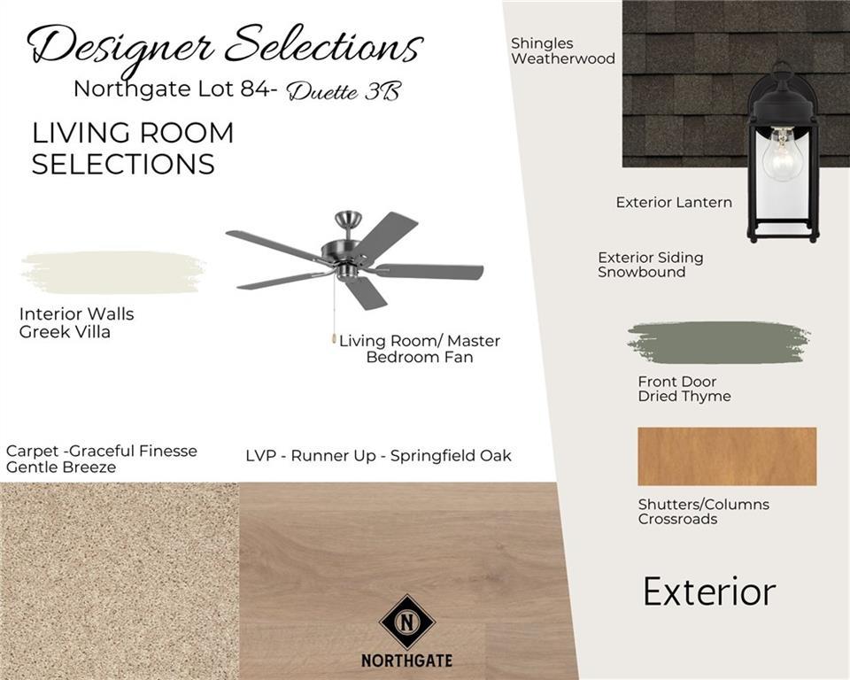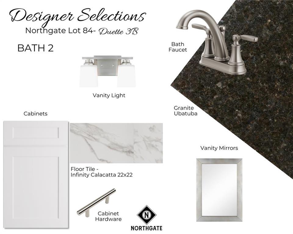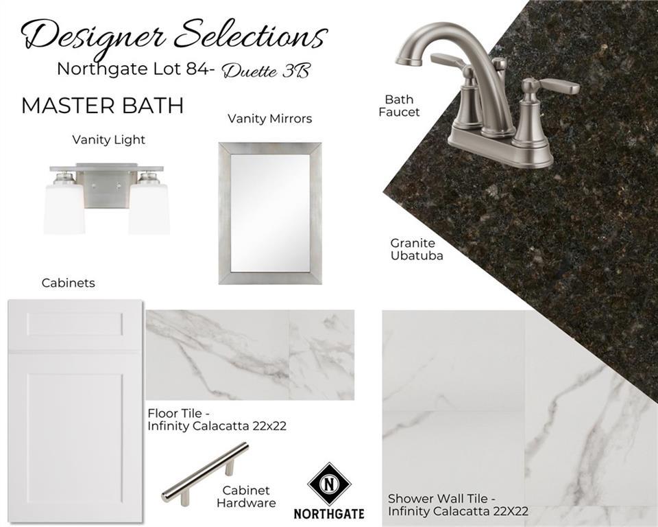 Description: Close in 30days on this New Designer Duette at Northgate Lot 84! The Duette 3B is a two bedroom, two bathroom, 1183 square foot home. As you enter into the home, you enter into the living room that features large windows, vaulted ceilings and a reading nook. The living room leads to the open concept dining room and kitchen that features custom cabinets and a large center island. As you make your way to the back of the home, you will find the guest bedroom and guest bathroom and laundry room. The owners retreat rests on the back of the home and features an en suite bathroom and large walk-in closet as well as access to the back porch and outdoor storage closet. Phase 1 amenities include a dog run and fire pit area. Pool, pavilion, and pickle ball court to be amenities in a future phase.