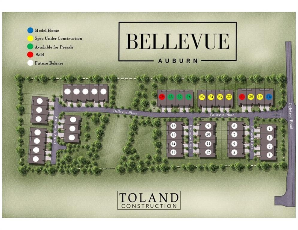 Description: MOVE IN READY! Toland Construction is proud to introduce Bellevue, home to 43 luxury townhomes located in the heart of Moores Mill. Featuring the style and luxury you expect from Toland with the low maintenance lifestyle and convenient location you need! This home features 2 bedrooms, 2 bathrooms, and an office on the main floor and a 3rd bedroom and 3rd bathroom on the second floor. 10' ceilings and hardwood floors throughout the main level, cabinets to the ceiling, butler's pantry, cast stone fireplace, zero entry master shower, extended rear porch with a second fireplace outside...it's all so so good. MUST SEE! 4' aluminum fences are permitted, lawn care maintained as part of HOA. Social Membership Initiation Waiver included to the Moores Mill Club with purchase. *ASK ABOUT OUR EARLY BIRD INCENTIVES*
