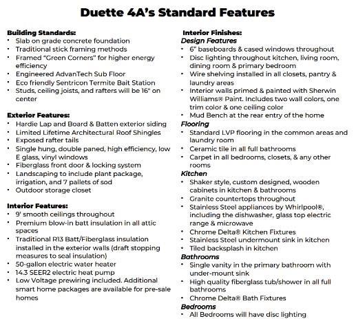 Description: Pre-Sale Duette 4A on Lot 92! Make this home Uniquely Yours by choosing from all our customizable selections, fixtures, etc. Privacy Fence Included on This Home! The Duette 4A is a two bedroom, two bathroom, 1237 square foot home. As you enter into the home, you enter into the living room that features large windows and vaulted ceilings. The living room leads to the open concept dining room and kitchen that features custom cabinets and a large center island. As you make your way to the back of the home, you will find the guest bedroom and guest bathroom and laundry room. Across from the laundry room is the back hallway that leads to the rear entry of the home that features a hall closet and a mud bench. The owners retreat features a spacious bedroom with an en suite bathroom and walk-in closet. The outdoor patio rests on the back of the home and features an outdoor storage closet. Phase 1 amenities include a dog run/fire pit area. Pool, pavilion, and pickle ball court to be added in future phase.