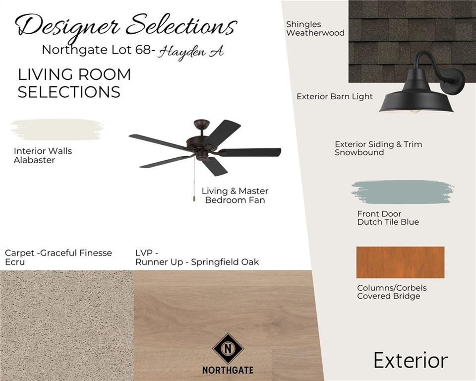 Description: Designer Home Lot 68 - The Hayden A Floor Plan! MOVE-IN MARCH 2026! The Hayden Plan features three bedrooms, two bathrooms and spans across 1411sq ft. When you enter into the home, the foyer leads into the laundry room and access to the two car garage. The home flows into the open concept dining and kitchen area that features a large center island, a spacious pantry and floor to ceiling windows. The kitchen opens into the living room that overlooks the back covered porch. The primary bedroom rests on the back of the home and features a spacious walk-in closet and bathroom. The second and third bedrooms are on the front of the home and share a hall bathroom. Phase 1 amenities include a dog run and fire pit area. Pool, pavilion, and pickleball court to be amenities in a future phase.