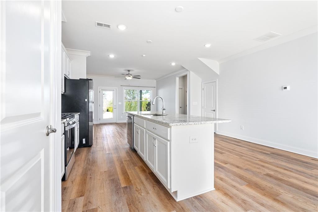 Description: This like new interior townhome features 2 bedrooms and 2.5 bathrooms. The front door opens into a large dining area that overlooks a beautiful kitchen with a gas range and massive island with ample room for a breakfast table. The living room is full of light and leads to a covered back porch. There are also 2 storage closets and a half bath on the main level. Head up the wood stairs to a landing area with a closet, nook, and laundry. The Master Bedroom is spacious featuring a tray ceiling and opens up to the Master Bathroom with a private water closet and a super shower with bench. The Second Bedroom is also spacious with it's own private bathroom that is full of natural light. The refrigerator and washer/dryer will stay with the home!