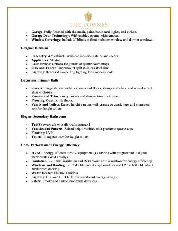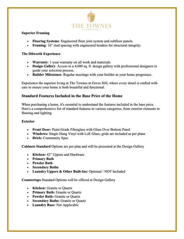Description: The Townes at Grove Hill is Dilworth Development, Inc's highly anticipated new community! Serene setting in sought after Grove Hill and showcasing a gracious open living floor plan & large island setting the perfect space for entertaining or everyday living. Large primary en-suite with double vanities and walk-in shower. Home will feature solid surface quartz countertops throughout & stainless appl. Located close to Auburn University, Tiger Town, Shopping & Dining. INTERIOR unit with single car garage and covered back porch. Community Club house, two pools, playground, sidewalks through out!
