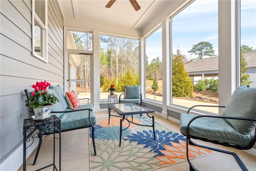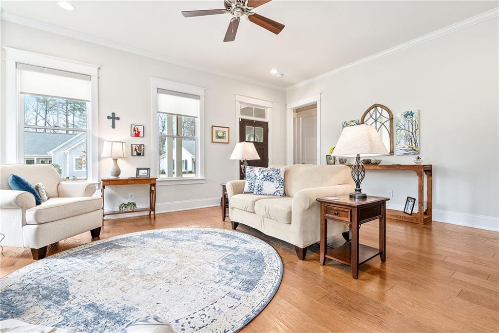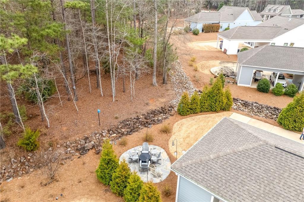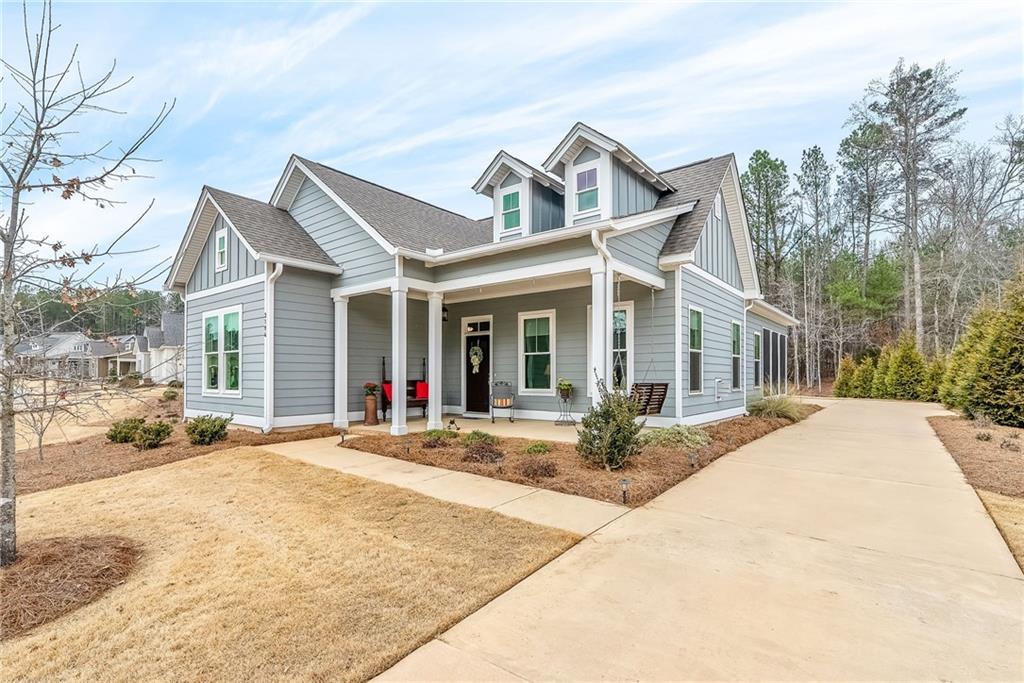 Description: Lovely, charming home in desirable National Village with all the amenities to enjoy a resort lifestyle. This home sits on an ideal flat lot that lives larger than most because of buffer area and rear woods. The split floor plan provides maximum privacy for primary suite and feature hardwood floors throughout. The large kitchen is lovely with an oversized island with seating , built in pantry and coffee station. The primary bath will certainly impress with large custom shower, counter to ceiling mirror and timeless finishes. The laundry room is conveniently located just off the rear entrance with sink, cabinetry and window for natural light. This home has an abundance of natural light from all directions adding to the airy, fresh feel. Charm doesn’t end inside….outside you’ll find three more areas to relax. The large front porch with swing will be a favorite anytime of the day. Just of the dining room is a charming, private screen porch with outside access. The rear yard features a private custom-built fire pit of natural stone looking over the back wooded area.