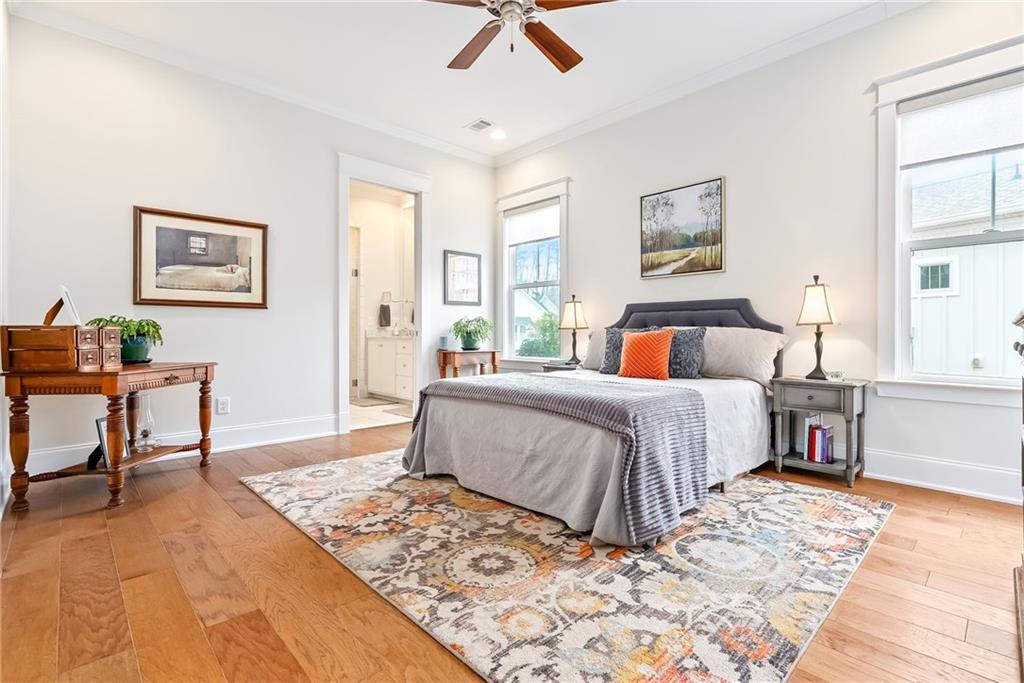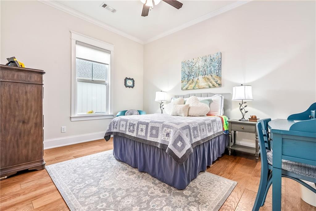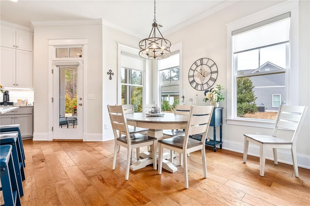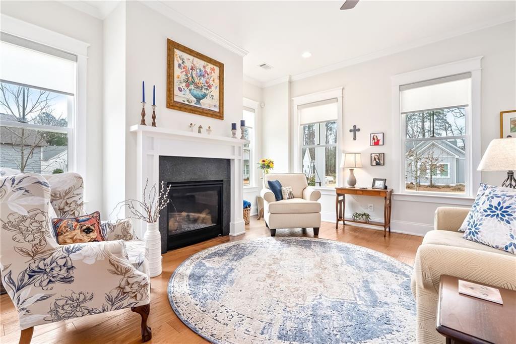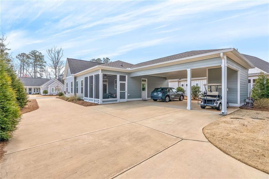 Description: Lovely, charming home in desirable National Village with all the amenities to enjoy a resort lifestyle. This home sits on an ideal flat lot that lives larger than most because of buffer area and rear woods. The split floor plan provides maximum privacy for primary suite and feature hardwood floors throughout. The large kitchen is lovely with an oversized island with seating , built in pantry and coffee station. The primary bath will certainly impress with large custom shower, counter to ceiling mirror and timeless finishes. The laundry room is conveniently located just off the rear entrance with sink, cabinetry and window for natural light. This home has an abundance of natural light from all directions adding to the airy, fresh feel. Charm doesn’t end inside….outside you’ll find three more areas to relax. The large front porch with swing will be a favorite anytime of the day. Just of the dining room is a charming, private screen porch with outside access. The rear yard features a private custom-built fire pit of natural stone looking over the back wooded area.