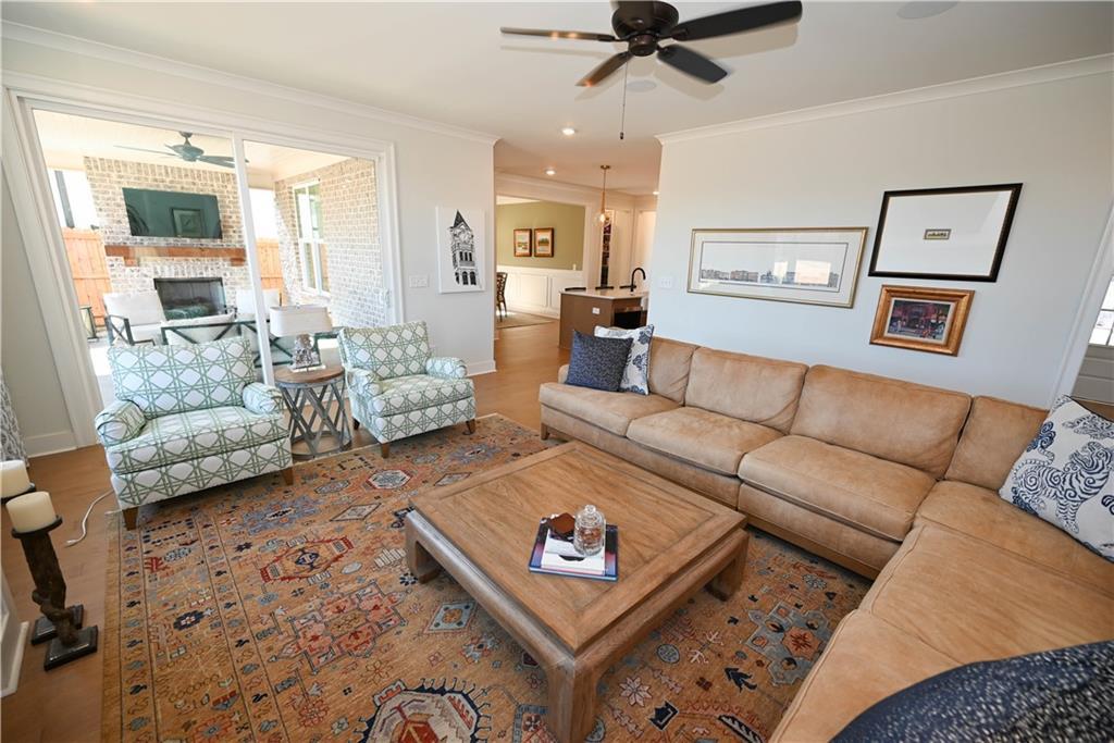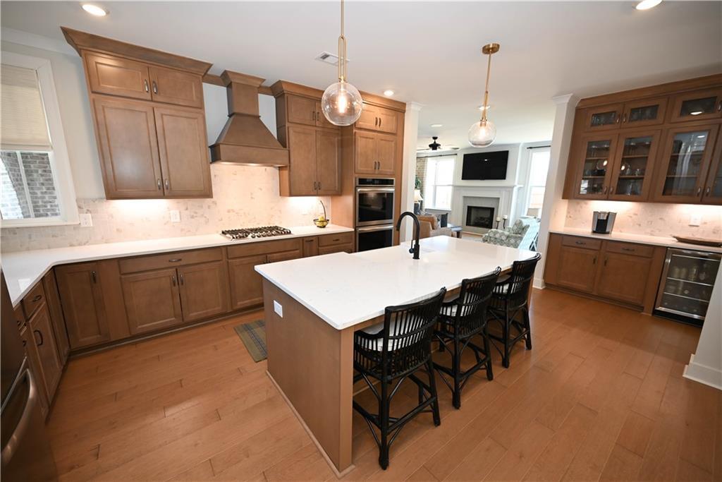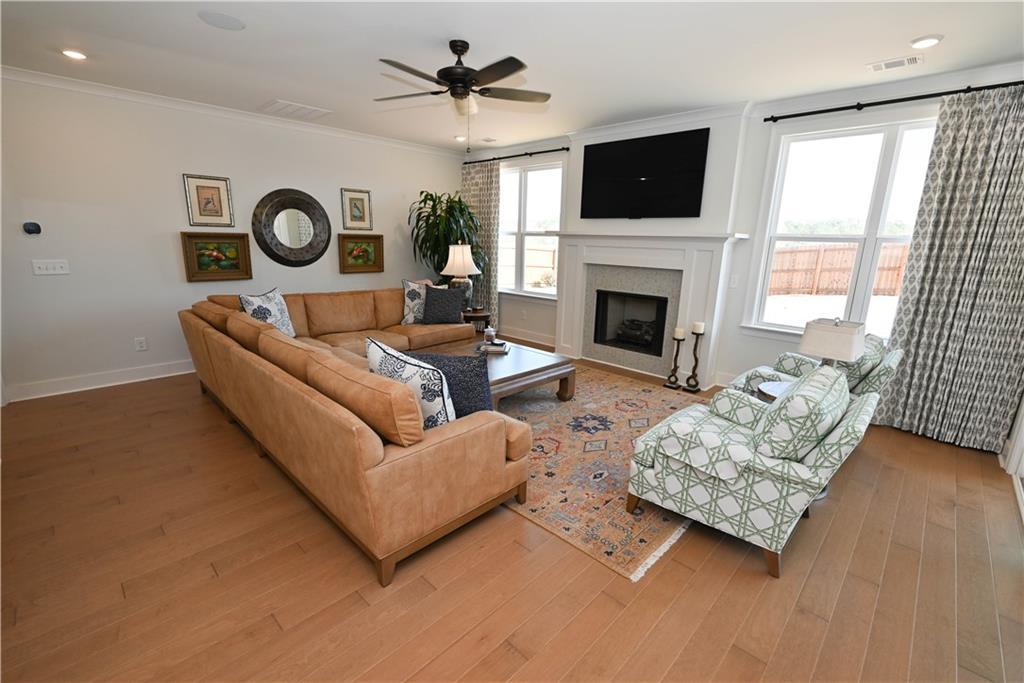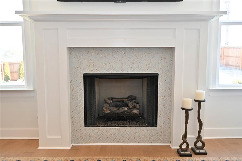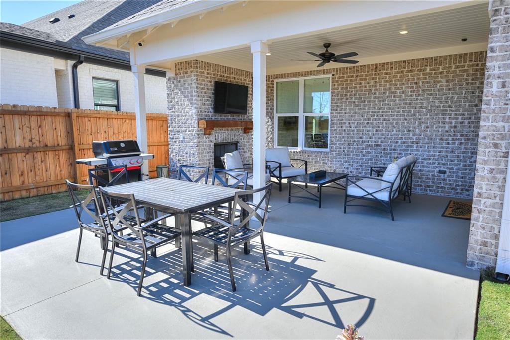 Description: Framed by a striking arched brick entry & timeless exterior detail, this 4BR/3.5BA home blends architectural character w/ a highly functional floorplan designed for modern living. A zero-step front entry leads into a soaring two-story foyer featuring a custom accent wall & abundant natural light that gives the home a light & airy vibe. The main level flows effortlessly, anchored by a spacious great room showcasing a gas fireplace w/ classic mantle & herringbone tile surround, all framed by expansive windows overlooking the back yard. Integrated wiring & ceiling speakers—along with an open flow into kitchen & dining—make this an entertainer's dream home! The kitchen delivers both polish & performance: custom ceiling-height cabinetry & matching vent hood, undercabinet lighting, gas cooktop, double ovens, quartz countertops, apron-front farmhouse sink, & an oversized island ideal for gathering. A walk-in pantry provides exceptional storage, while the built-in beverage station—complete w/ beverage fridge & glass-front display cabinetry—creates the perfect coffee bar or entertaining alcove. Just off the kitchen is an elegant dining room featuring a coffered ceiling & detailed wainscoting. Privately positioned on the main level, the primary suite offers a tray ceiling, soft natural light, two amazing walk-in closets w/ custom storage system, & a spa-inspired bath including a freestanding soaking tub beneath a window, tiled shower, dual vanities, quartz counters, & water closet. A powder room & well-appointed laundry w/ built-in cabinetry complete the main floor. Upstairs, a spacious second living area w/ charming window seats offers flexible space for a bonus or media room. One bedroom enjoys a private en-suite bath, while the additional bedrooms share a beautifully finished hall bath. Outdoor living shines on the covered back porch w/ its fireplace, integrated wiring, & attached patio w/ built-in gas grill line, all overlooking the fenced back yard.