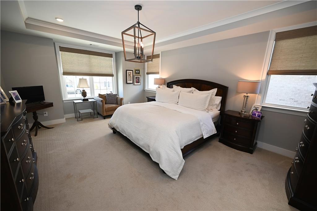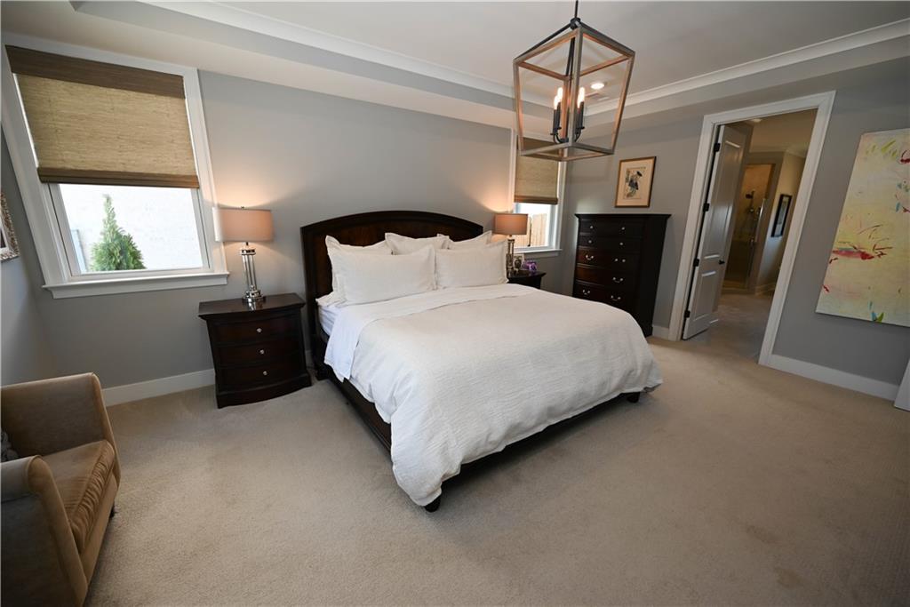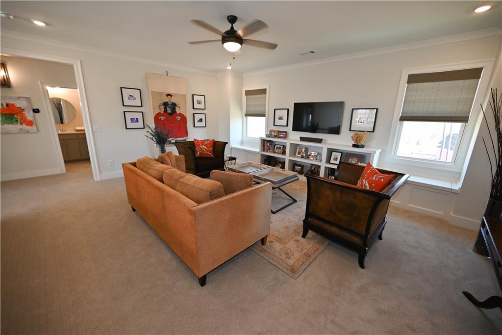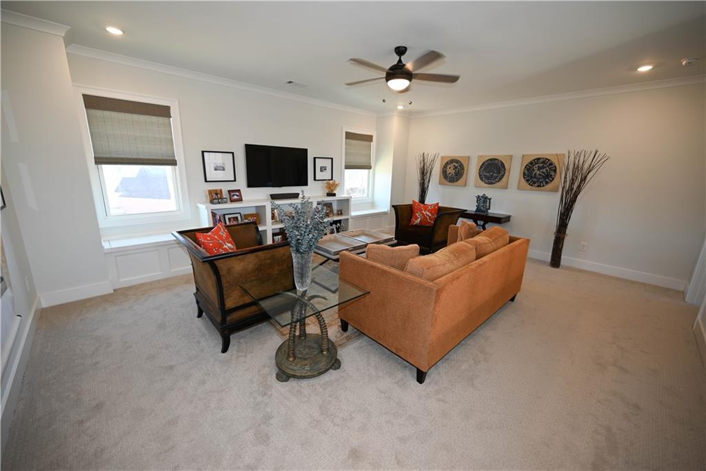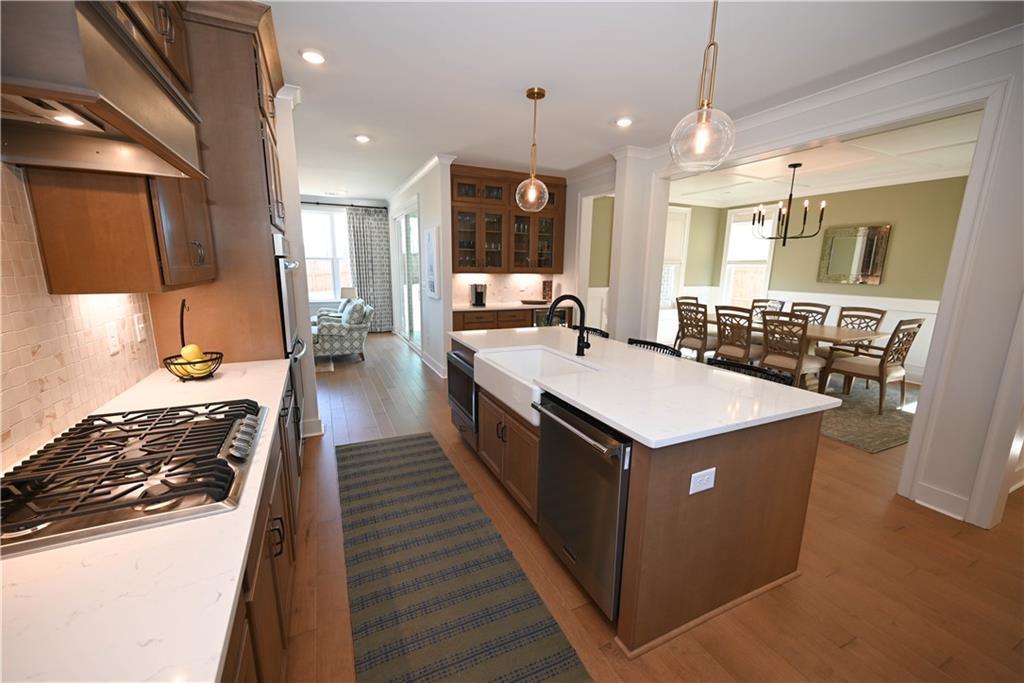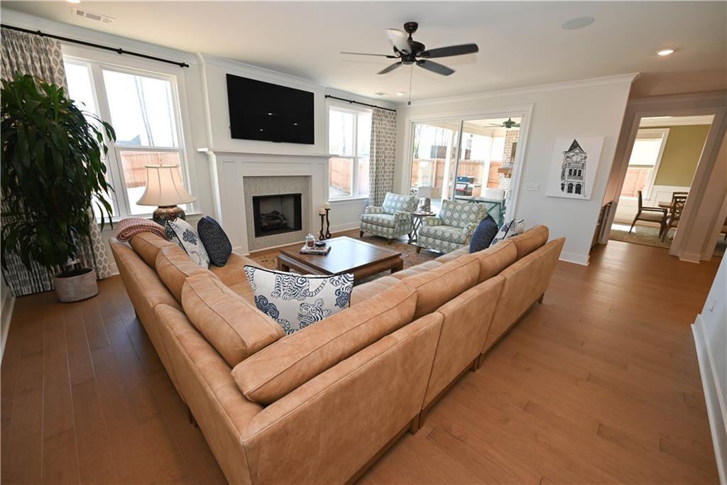 Description: Framed by a striking arched brick entry & timeless exterior detail, this 4BR/3.5BA home blends architectural character w/ a highly functional floorplan designed for modern living. A zero-step front entry leads into a soaring two-story foyer featuring a custom accent wall & abundant natural light that gives the home a light & airy vibe. The main level flows effortlessly, anchored by a spacious great room showcasing a gas fireplace w/ classic mantle & herringbone tile surround, all framed by expansive windows overlooking the back yard. Integrated wiring & ceiling speakers—along with an open flow into kitchen & dining—make this an entertainer's dream home! The kitchen delivers both polish & performance: custom ceiling-height cabinetry & matching vent hood, undercabinet lighting, gas cooktop, double ovens, quartz countertops, apron-front farmhouse sink, & an oversized island ideal for gathering. A walk-in pantry provides exceptional storage, while the built-in beverage station—complete w/ beverage fridge & glass-front display cabinetry—creates the perfect coffee bar or entertaining alcove. Just off the kitchen is an elegant dining room featuring a coffered ceiling & detailed wainscoting. Privately positioned on the main level, the primary suite offers a tray ceiling, soft natural light, two amazing walk-in closets w/ custom storage system, & a spa-inspired bath including a freestanding soaking tub beneath a window, tiled shower, dual vanities, quartz counters, & water closet. A powder room & well-appointed laundry w/ built-in cabinetry complete the main floor. Upstairs, a spacious second living area w/ charming window seats offers flexible space for a bonus or media room. One bedroom enjoys a private en-suite bath, while the additional bedrooms share a beautifully finished hall bath. Outdoor living shines on the covered back porch w/ its fireplace, integrated wiring, & attached patio w/ built-in gas grill line, all overlooking the fenced back yard.