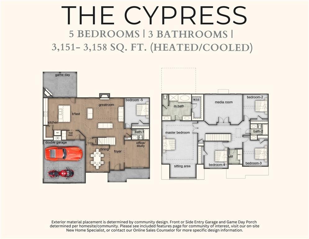 Description: Welcome to Cherry Hill, Smiths Station's premier community, where convenience meets luxury! Introducing the Cypress D floorplan, offering 3151 sq. ft. of elegant living space with 5 bedrooms and 3 baths, perfectly suited for everyday living and entertaining. An inviting entry foyer leads to the formal dining room, which features coffered ceilings and elegant trim work, making it ideal for hosting gatherings. A versatile flex space offers the ideal spot for a home office or playroom. The expansive great room is filled with natural light and centers around a cozy wood-burning fireplace, perfect for relaxing. chef-inspired kitchen with soft-close cabinetry, granite countertops, tiled backsplash, and stainless-steel appliances, including an electric range, oven/stove combo, and microhood. The oversized center island with sink and dishwasher. A sunny breakfast area keeps everyone connected. The generous pantry offers excellent storage space. A main-level fifth bedroom and full bath provide excellent guest or multigenerational living options. The owner’s entry includes Hughston Homes’ Signature Drop Zone with built-in cubbies for everyday organization. Upstairs, enjoy a step-up media room ideal for movie nights or game days. The luxurious owner’s suite features tray ceilings, a private sitting area, a spa-like bath with a garden tub, tiled shower, dual vanities, and a spacious walk-in closet. Additional bedrooms are generously sized, with a convenient upstairs laundry and hall bath. Luxury flooring highlights the main living areas. Outdoor living shines on the signature Gameday Patio with a wood-burning fireplace, ceiling fan, TV outlet, and outdoor speakers. Tons of included luxury features! This home truly has it all!