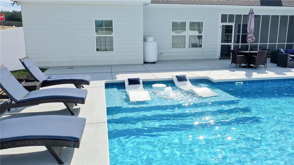 Description: This beautiful, very well maintained, 4 BR/3BA home offers an inviting open layout and numerous premium features. Step outside the screened-in back porch and enjoy a 20x40 in-ground saltwater pool complete w/a waterfall, swim ledge, & cool deck-ideal for outdoor living.The eat-in kitchen boasts a large island, stunning quartz countertops, SS appliances (gas stove), and a walk-in pantry perfect for both cooking and entertaining. The cozy living room highlights a charming wood burning FP, while the formal DR provides an elegant setting for meals, etc. The oversized master suite is a true retreat, featuring a sitting area and an ensuite bath with his/hers closets, dual vanities, a walk-in shower w/double shower heads, and a soaking tub for relaxation. 2 additional rooms share a well-appointed bathroom. The backyard is fully enclosed with vinyl fencing for added privacy. With a laundry room and ample storage throughout, this home combines luxury and convenience in every detail. This is a MUST See! ALL furniture, pool table, fridge in garage, and washer/dryer is optional in the sell of the property w/acceptable offer. Seller to pay up to $8,000 in seller concessions with acceptable offer.