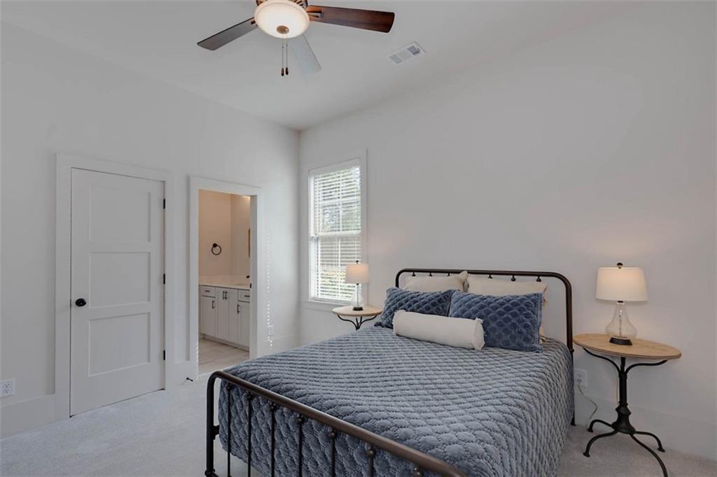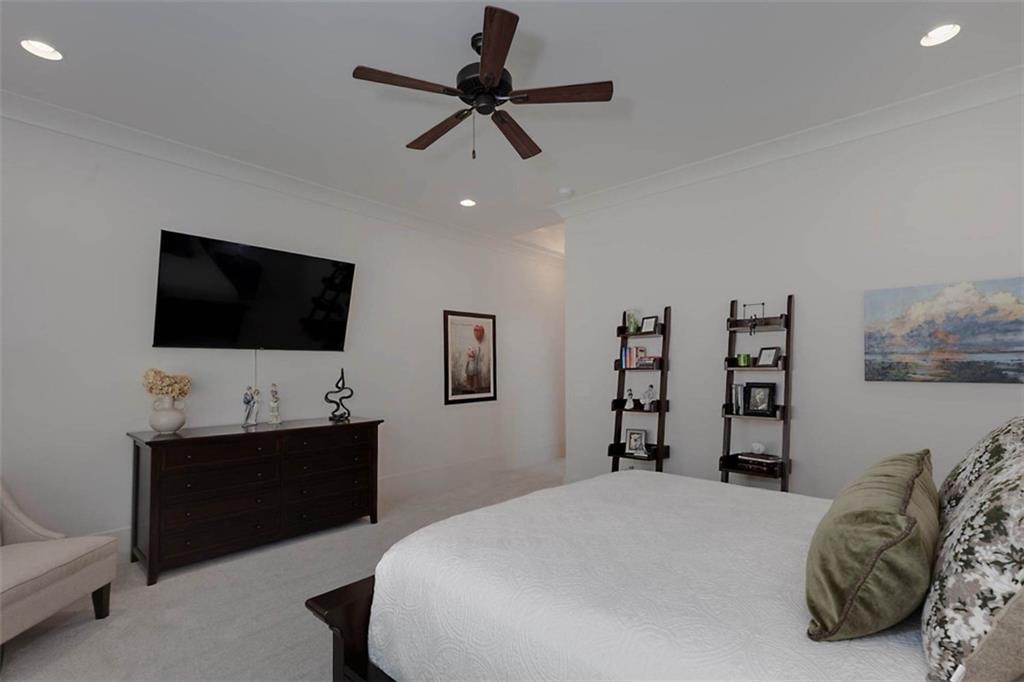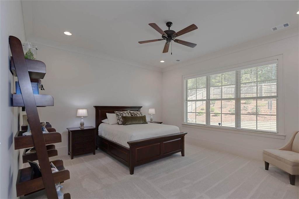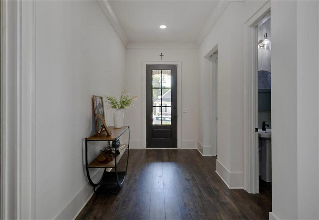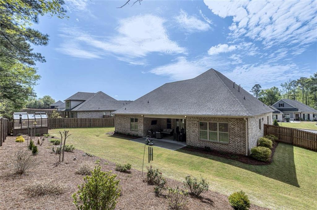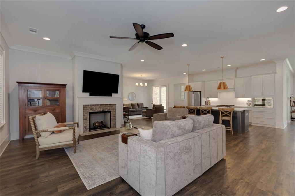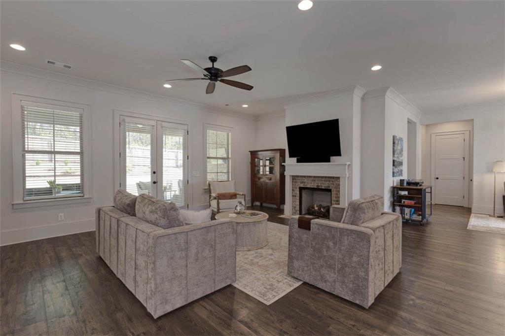 Description: Immaculate brick home with impeccable finishes-10’ ceilings, 7“ cove moulding, 9.5” base boards, 8’ doors and distinctive trim. Hardwood laminate flooring throughout main living areas complemented by new luxury carpeting in all bedrooms. One level layout features split bedrooms for privacy. Primary offers an ensuite with separate vanities, oversized frameless walk-in shower, soak tub, and large walk-in closet. Bedroom 2 has an ensuite and bedrooms 3 & 4 share an ensuite with separate vanities. The kitchen shines with a grand island, high-end appliances, soft close cabinetry, under-cabinet lighting and butler's pantry with walk-in pantry. The living room boasts a brick gas log fireplace with custom mantel. Adjacent flex space opens through double French doors to a courtyard porch. The laundry room features a washer/dryer, sink, and cabinet storage. Enjoy the extended patio with built-in speakers, TV and fully landscaped fenced yard with wooded privacy.