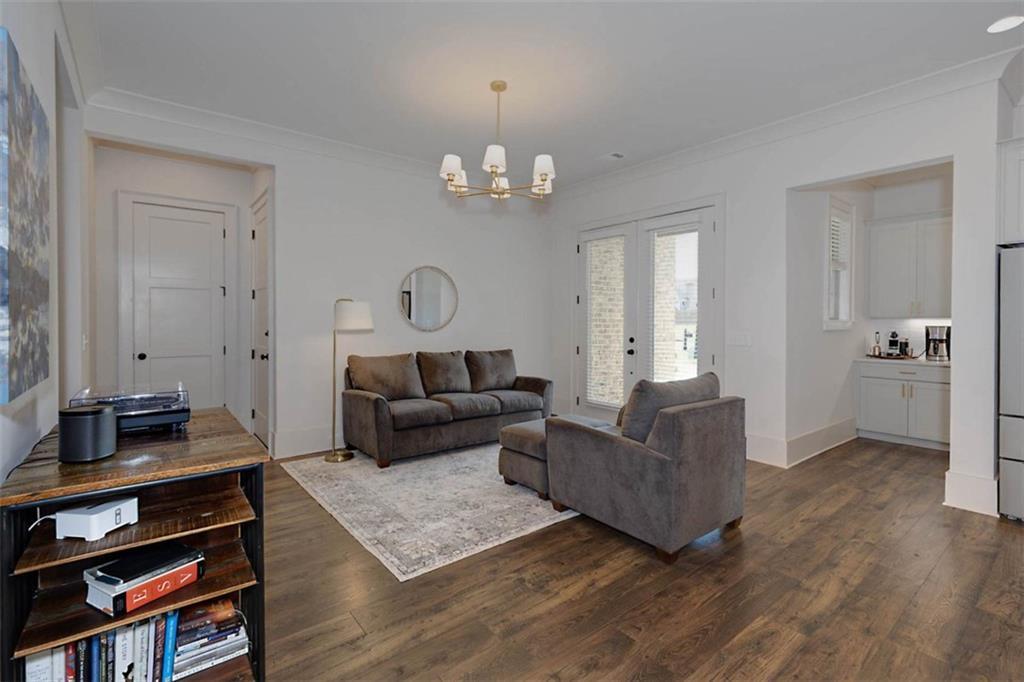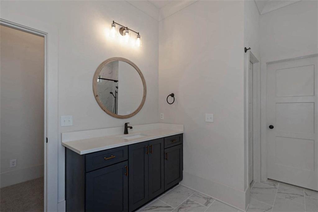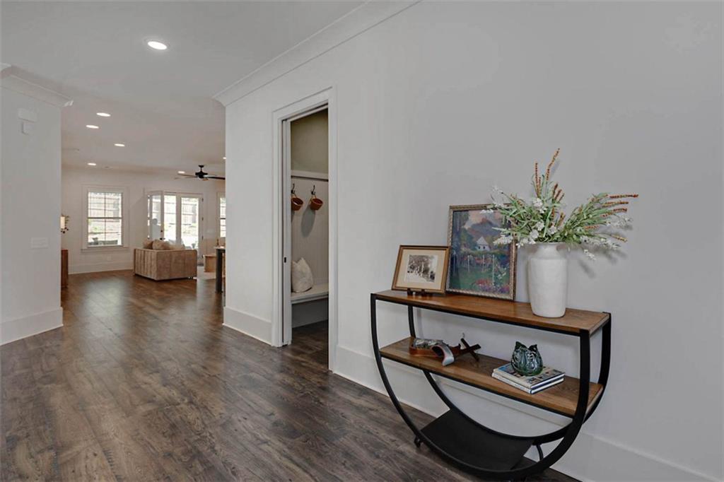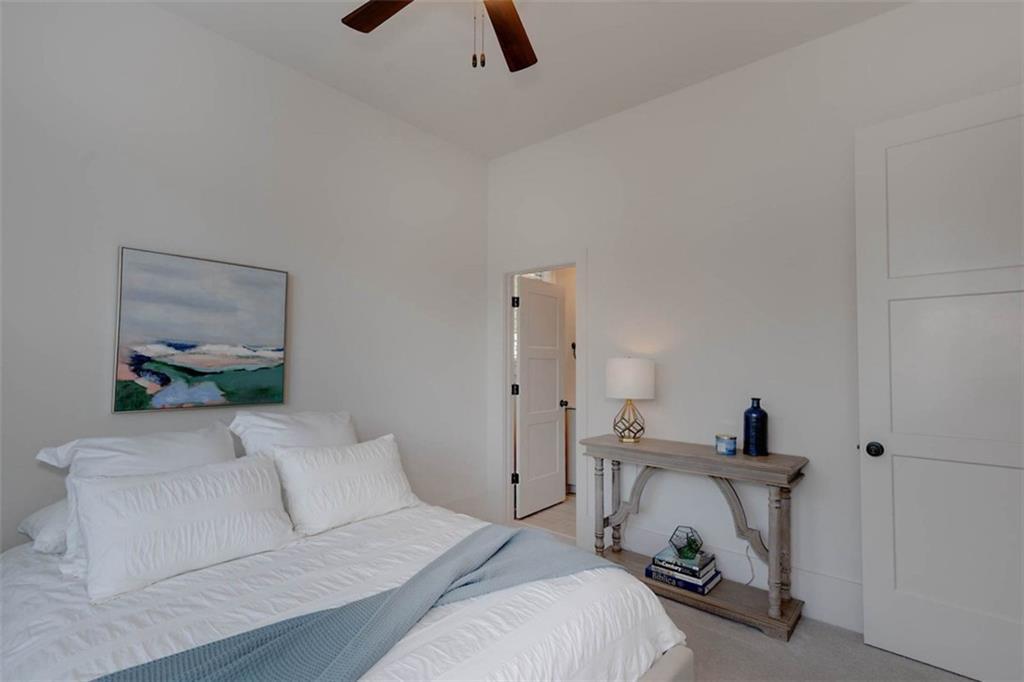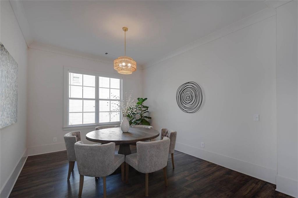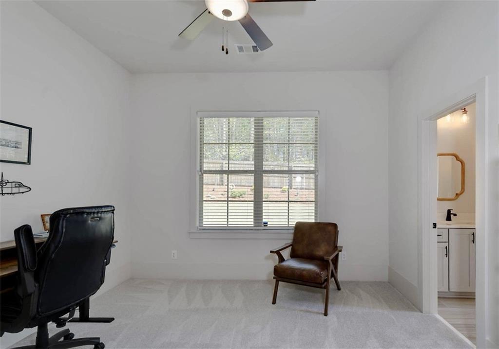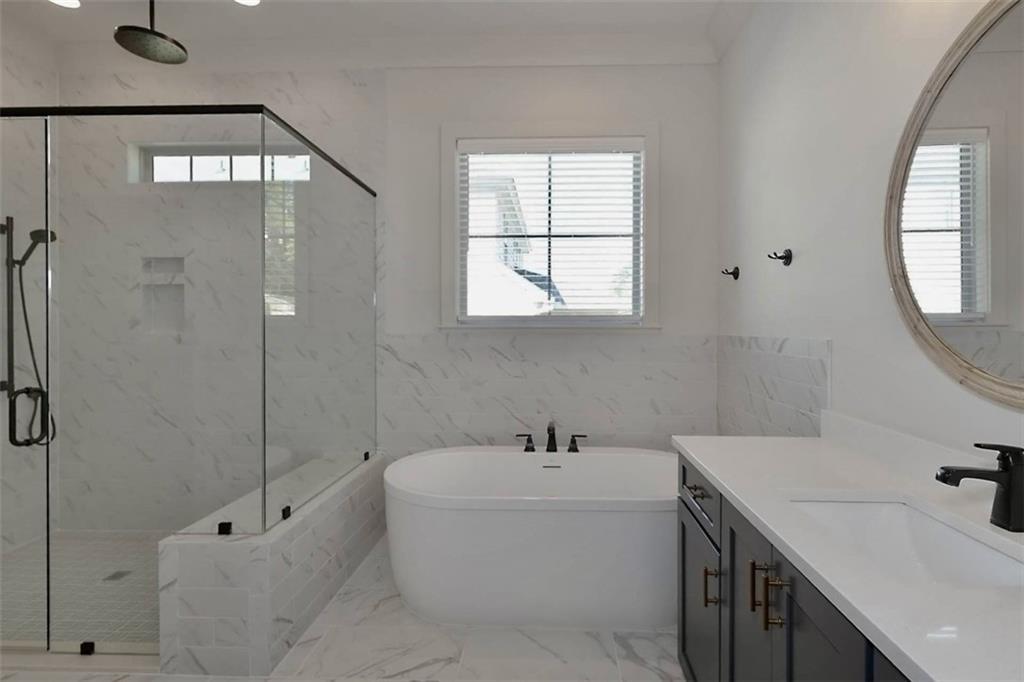 Description: Immaculate brick home with impeccable finishes-10’ ceilings, 7“ cove moulding, 9.5” base boards, 8’ doors and distinctive trim. Hardwood laminate flooring throughout main living areas complemented by new luxury carpeting in all bedrooms. One level layout features split bedrooms for privacy. Primary offers an ensuite with separate vanities, oversized frameless walk-in shower, soak tub, and large walk-in closet. Bedroom 2 has an ensuite and bedrooms 3 & 4 share an ensuite with separate vanities. The kitchen shines with a grand island, high-end appliances, soft close cabinetry, under-cabinet lighting and butler's pantry with walk-in pantry. The living room boasts a brick gas log fireplace with custom mantel. Adjacent flex space opens through double French doors to a courtyard porch. The laundry room features a washer/dryer, sink, and cabinet storage. Enjoy the extended patio with built-in speakers, TV and fully landscaped fenced yard with wooded privacy.